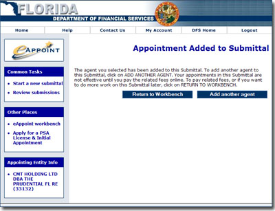 If you wish to add another agent to this submittal, click the Add another agent button. Otherwise, click the Return to Workbench button.