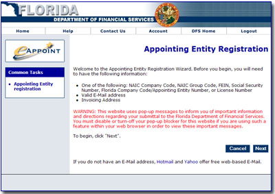 The first page of the Appointing Entity Registration Wizard is shown to the left. Before you begin, be sure to have the following information handy: