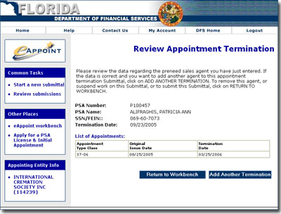 Review the data regarding the pre-need sales agent you have just entered. If the data is correct and you want to add another agent to this appointment termination submittal, click Add Another Termination . Otherwise, click Return to Workbench.